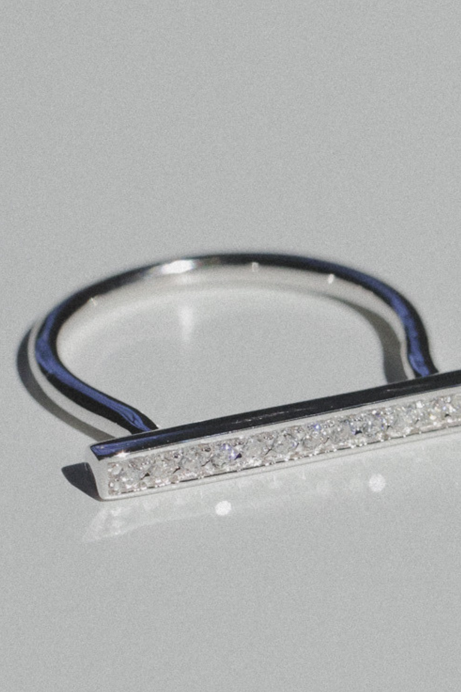 Minimal bar motif ring with aligned stones. The linear sparkle of the stones catches the eye. The ring band is a simple round shape for a casual look.